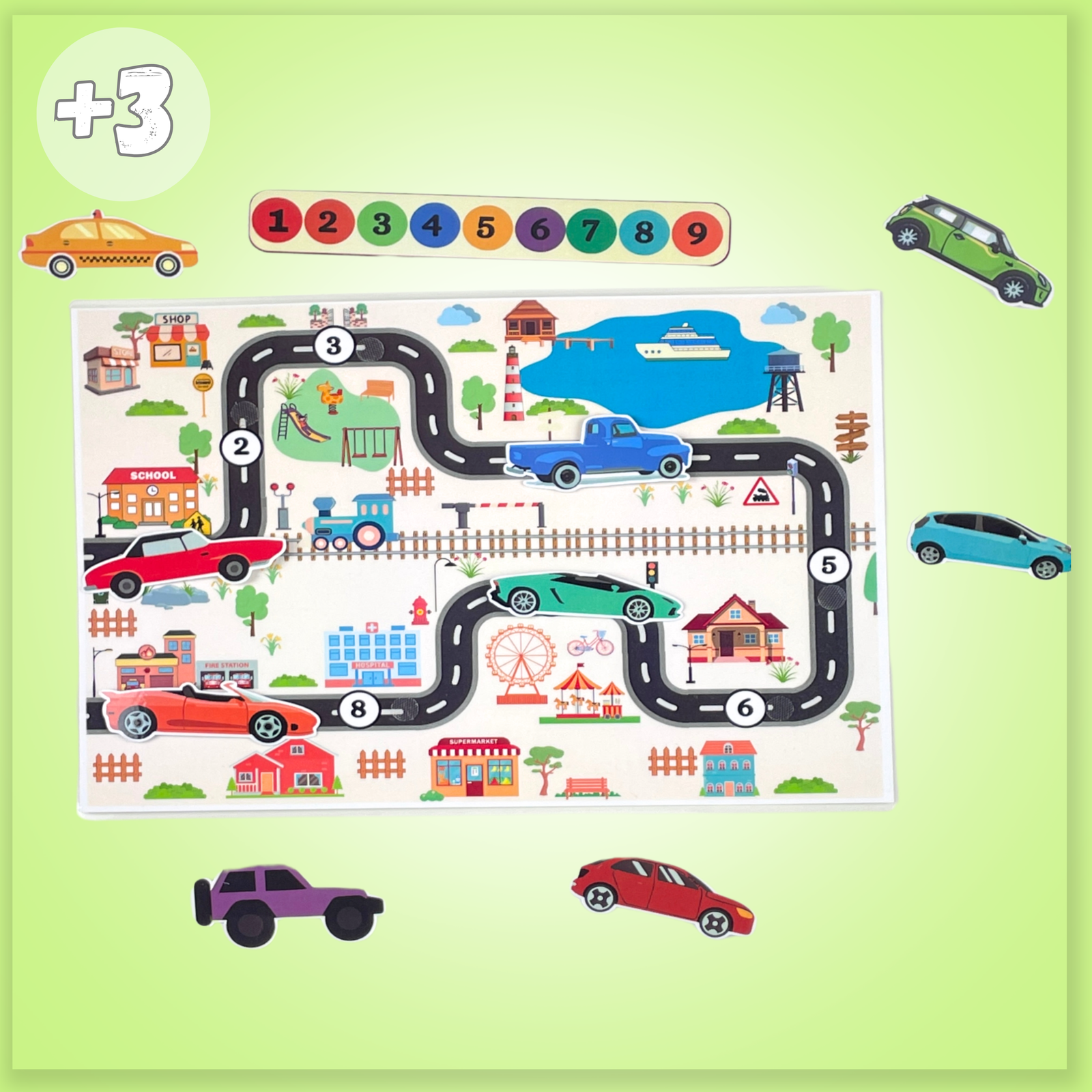هي لعبة تفاعلية تساعد طفلك على تعلّم الأرقام والألوان بطريقة مرحة. يتبع الطفل بطاقات تعليمية تحتوي على رقم ولون، ويضع السيارات في أماكنها الصحيحة على خريطة الطريق وفقًا لموقع الرقم واللون
